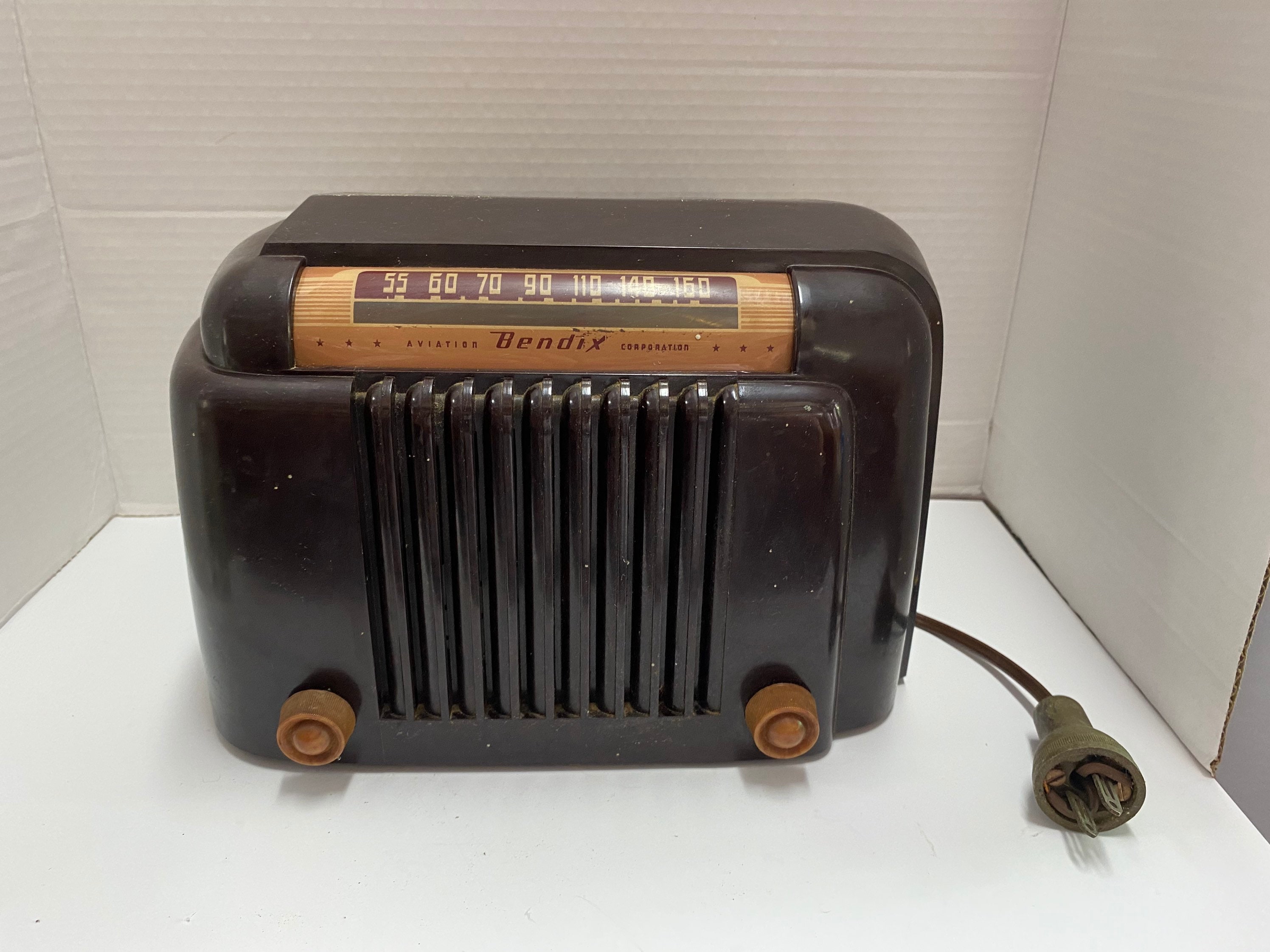 Vintage 1940s/1950s Bendix Aviation Corporation Bakelite Model 110 Radio in Working Condition with minor surface blemishes. 7”x10” with a 20” cord. Free shipping to the USA