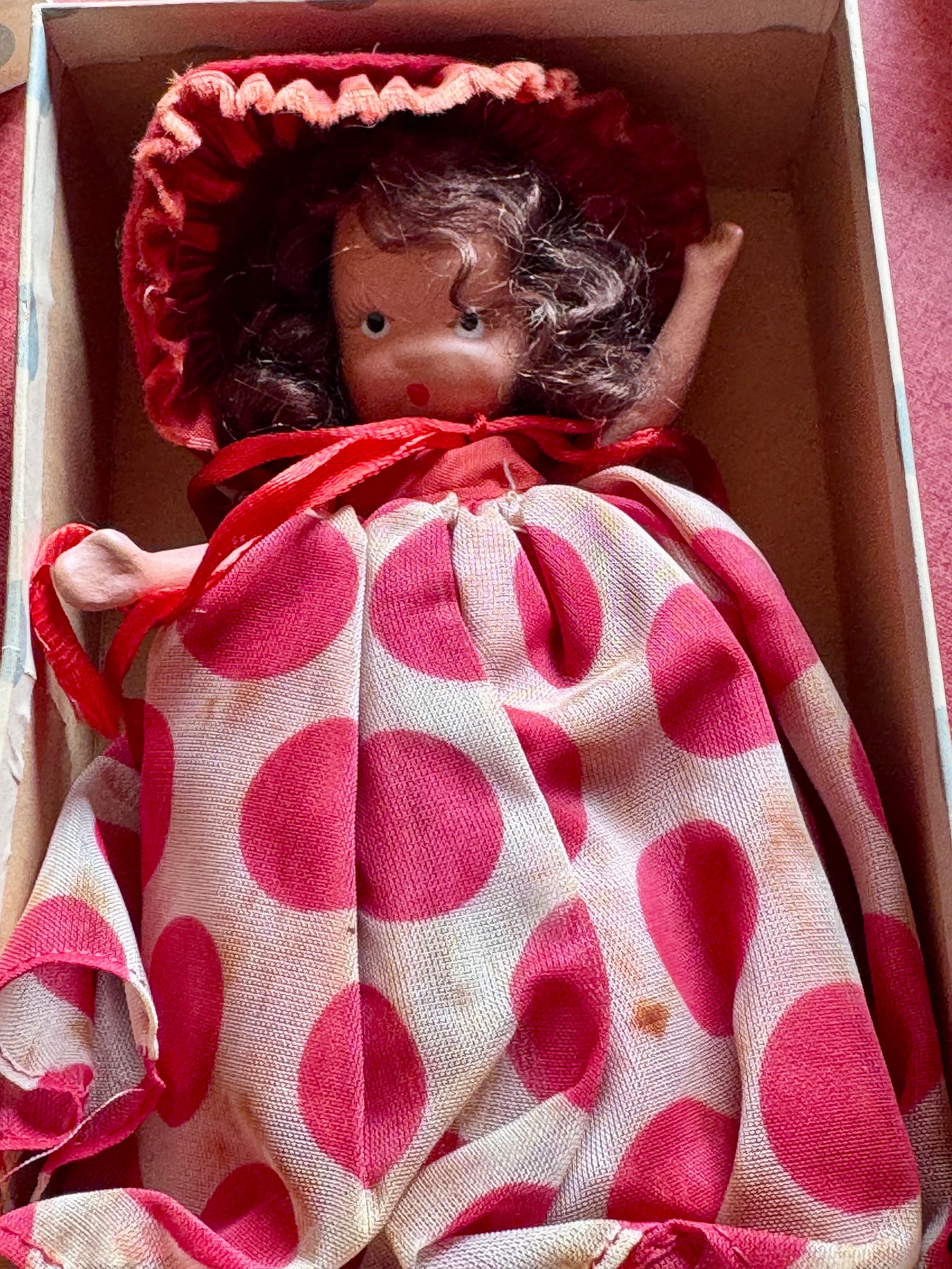 Nancy Ann storybook doll, Elsie Marley, brown hair 6"bisque 1940's in original outfit, with box, excellent condition. Free shipping.