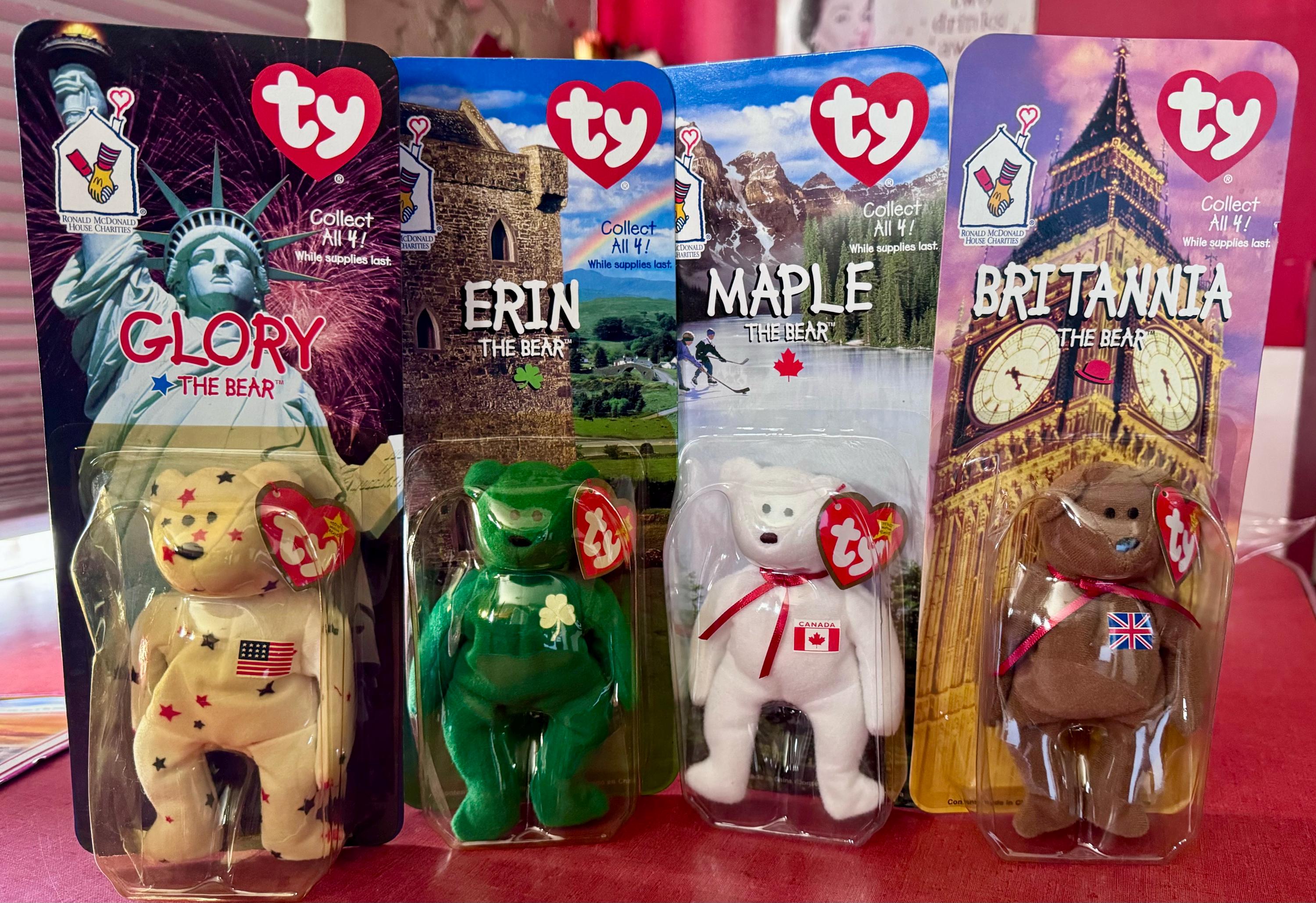1999 Ronald McDonald House Charities TY bears - set of four. Unopened, MIP, BRITTANNIA, GLORY, MAPLE & ERIN BEARS. Bears and package in very good condition. FREE shipping to USA.
