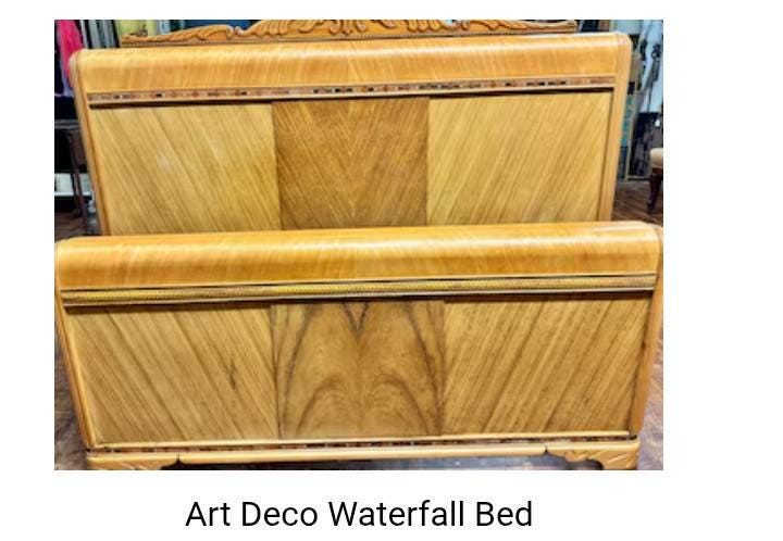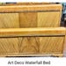 Gorgeous Art Deco Waterfall headboard, footboard and bed rails. Full (double) size. Satinwood veneers with banded design and carved back. Excellent refinished condition. Free shipping to the West Coast, higher elsewhere, please provide zip code for quote!